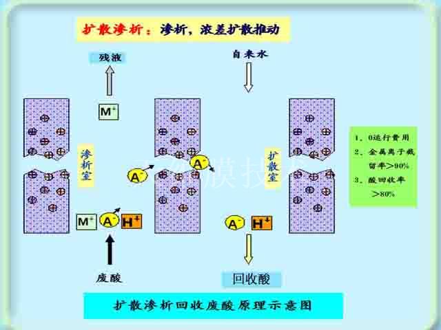 整個裝置是由一定數量的膜組成的一系列結構單元;其中每個單元由一張陰離子均相膜隔開成滲析室和擴散室,采用逆流操作,在陰離子均相膜的兩側分別通入廢酸液及接受液(自來水)時,廢酸液側的酸及其鹽的濃度遠高于水的一側,根據擴散滲析原理,由于濃度梯度的存在,廢酸及其鹽類有向擴散室滲透的趨勢,但膜對陰離子具有選擇透過性,故在濃度差的作用下,廢酸側的陰離子被吸引而順利地透過膜孔道進入水的一側。同時根據電中性要求,也會夾帶陽離子,由于H+的水化半徑比較小,電荷較少;而金屬鹽的水化半徑較大,電荷較多,因此H+會優先通過膜,這樣廢液中的酸就會被分離出來。