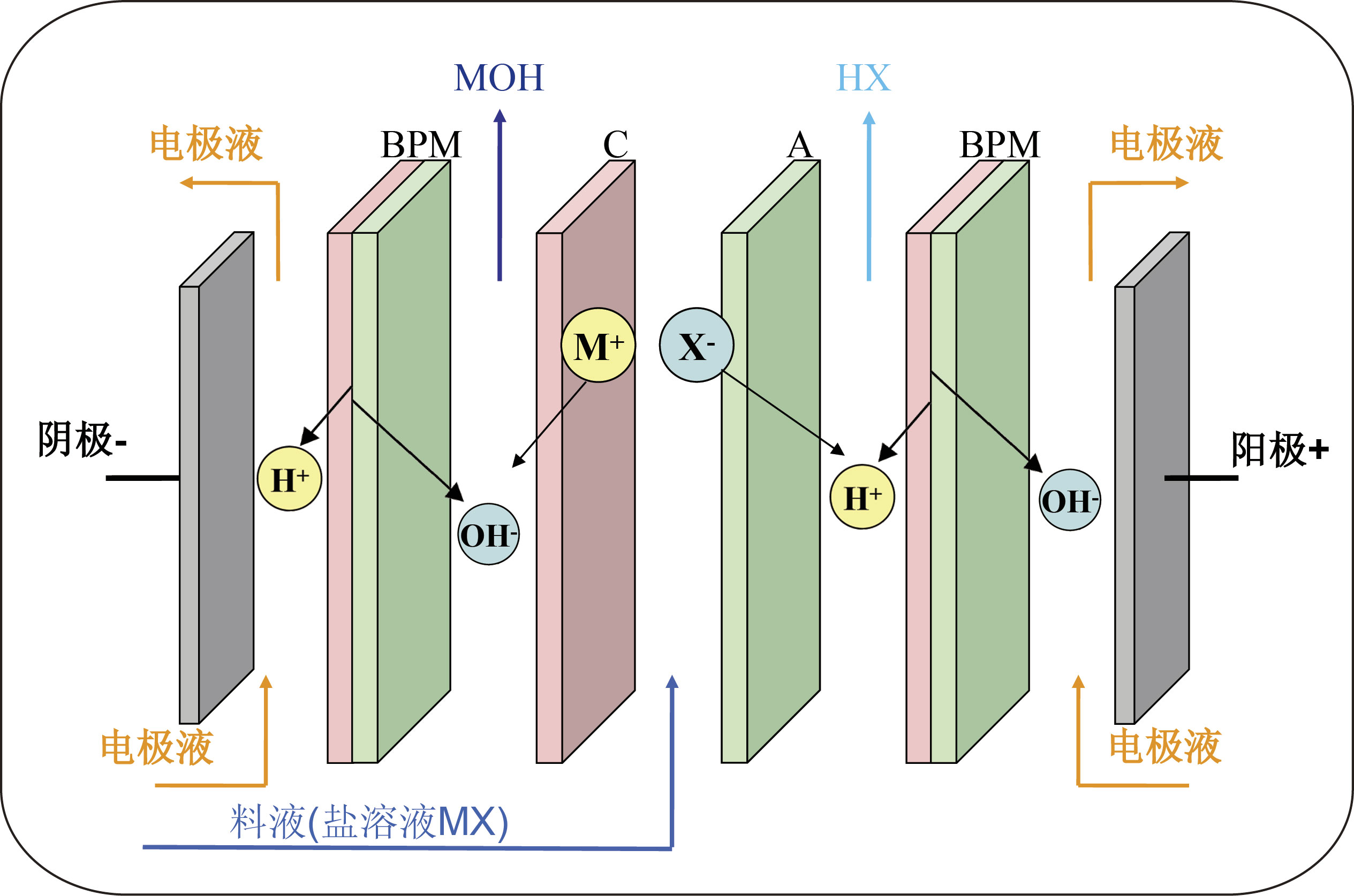 雙極膜是一種新型離子交換復(fù)合膜, 它通常由陽(yáng)離子交換層和陰離子交換層復(fù)合而成,用荷有不同電荷密度、厚度和性能的膜材料在不同的復(fù)合條件下,可制成不同性能和用途的雙極膜,這些用途最基本的原理是雙極膜界面層的水分子在反向加壓時(shí)的離解(又稱雙極膜水解離),即將水分解成氫離子和氫氧根離子。雙極膜電滲析就是基于上述的水解離和普通的電滲析原理的基礎(chǔ)上發(fā)展起來的,它是以雙極膜代替普通電滲析的部分陰、陽(yáng)膜或者在普通電滲析的陰、陽(yáng)膜之間加上雙極膜構(gòu)成的。雙極膜電滲析的最基本應(yīng)用是從鹽溶液(MX)制備相應(yīng)的酸(HX) 和堿 (MOH),如圖所示,料液進(jìn)入如圖所示的三室電滲析膜堆,在直流電場(chǎng)的作用下,鹽陰離子 (X-) 通過陰離子交換膜進(jìn)入酸室,并與雙極膜離解的氫離子生成酸 (HX);而鹽陽(yáng)離子(M+) 通過陽(yáng)離子交換膜進(jìn)入堿室,在那里與雙極膜離解的氫氧根離子形成堿(MOH)。